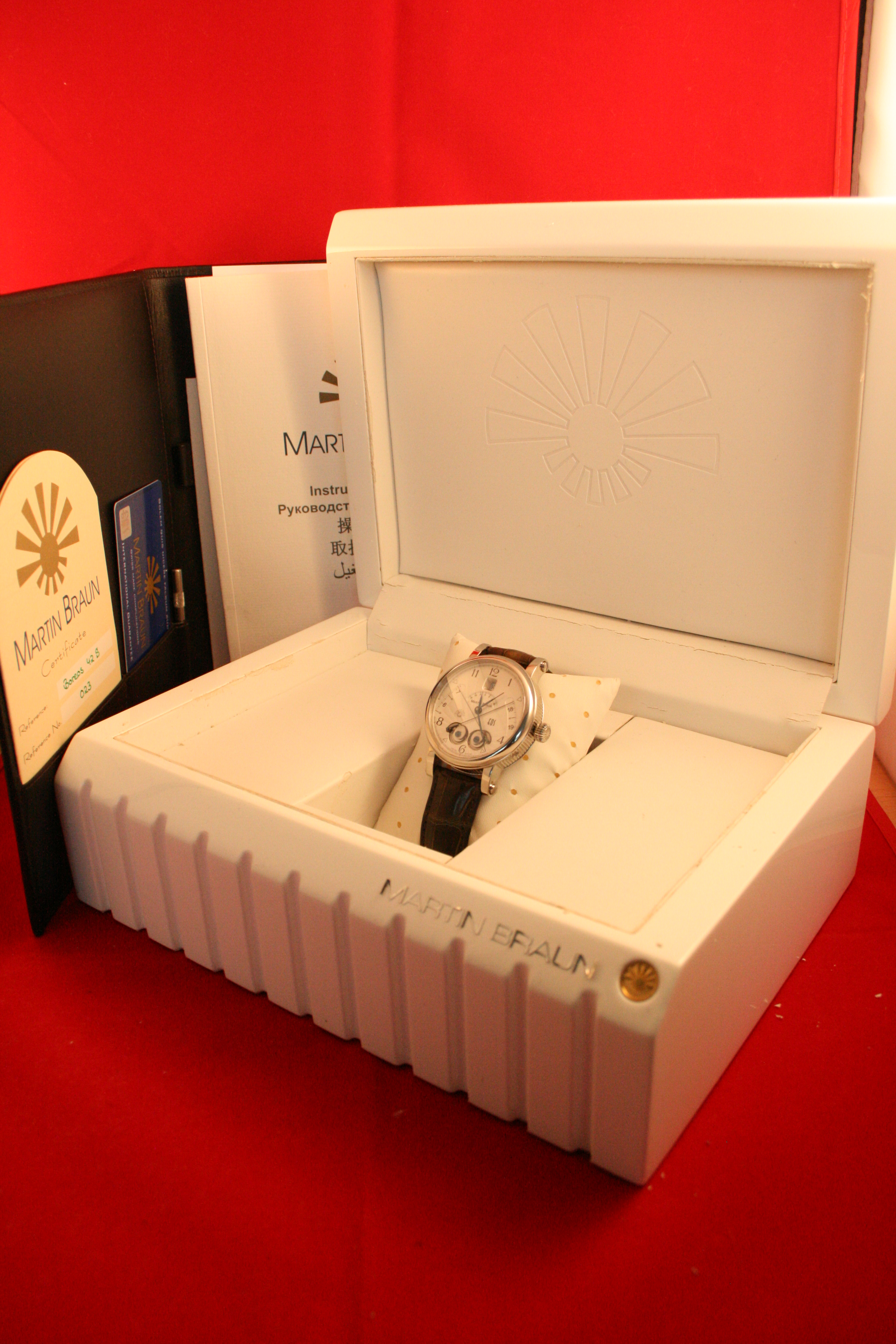 Self-winding movement MAB 88. 25 jewels. Hand-engraved, rotor with Geneva stripes. Perlage-finished bridges. Blued screws. Power reserve 42 h. Stainless steel polished 42.0 mm case, 12.5 mm height. Sapphire crystal. Screwed transparent case back. Waterproof to 30 m. Silver dial with guilloche pattern. Hours, minutes, date, Sunset and sunrise times, Equation of time. Hand-sewn Grey-Blue Alligator leather strap with tang-type buckle. An extremely rare highly collectible watch that is unworn and as new. Complete with all papers, manuals, instruction booklets, guarantee card, tool, guides, leather wallet and boxes.