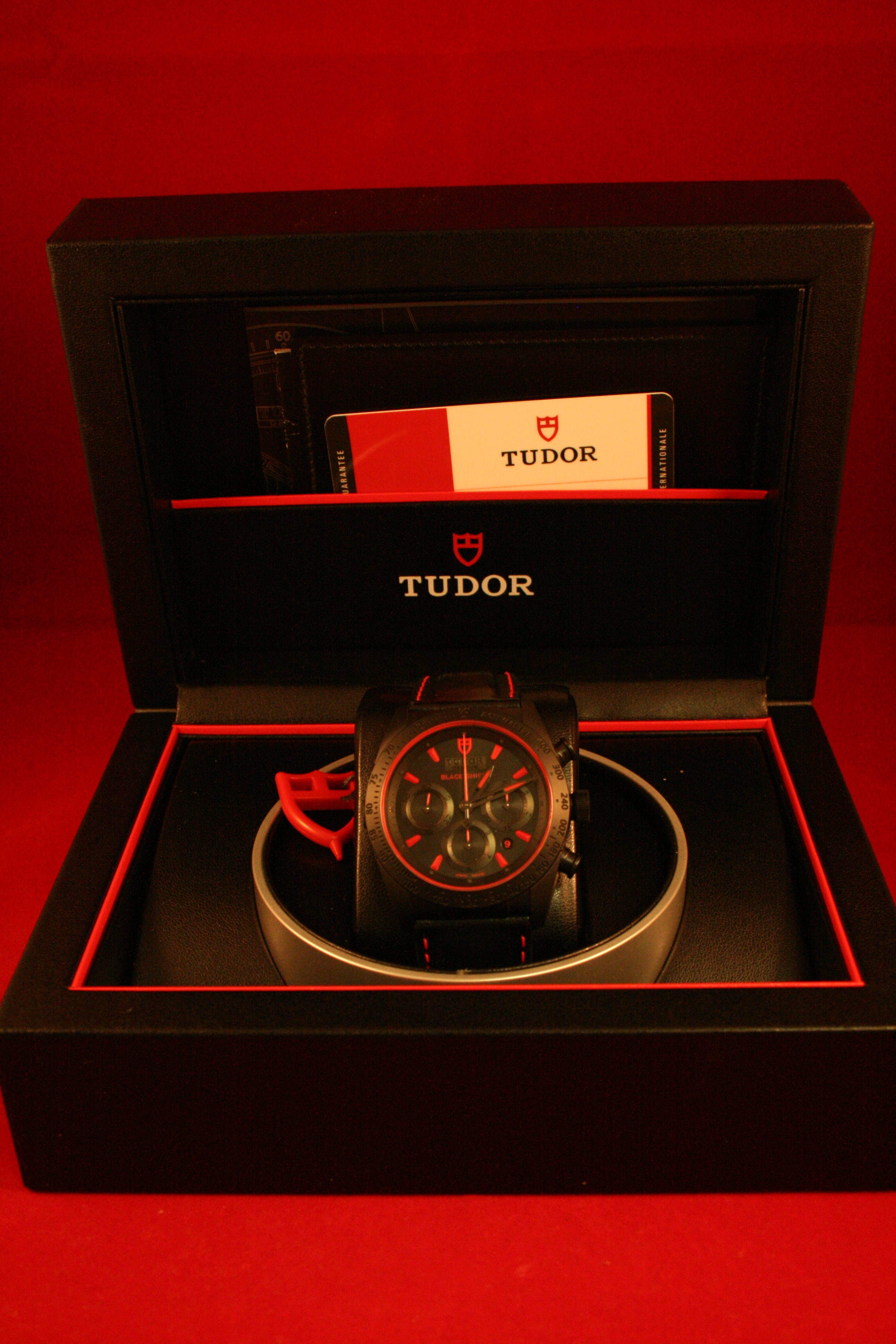 Ceramic Tudor Fastrider Black Shield Chronograph 42000CN. Self-winding mechanical chronograph 7753 calibre movement. Case diameter 42mm. Water resistant to 150 metres. 28,800vph, 27 jewels and 46 hours power reserve. Matt black dial with black sub dials and red hands and index. Date at 4.30 position. Functions: hours, minutes, subsidary seconds, chronograph and date. Sapphire crystal glass. Fixed matt black tachymetric scale bezel. Black leather strap, folding clasp and safety catch. Box and papers dated new 2015.