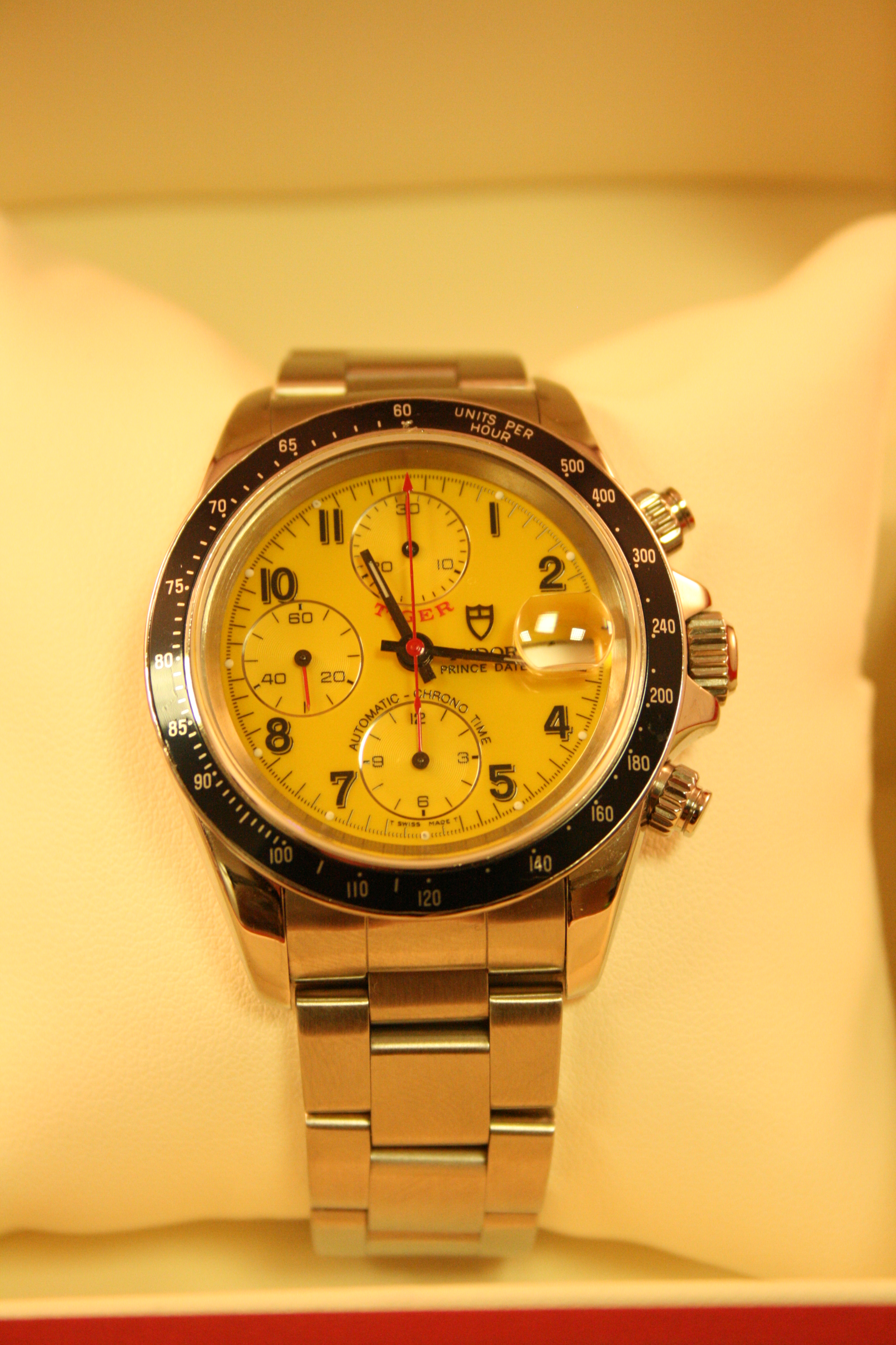 Steel Tudor Prince Date Automatic Chronograph 79260. Automatic movement. 40mm case diameter. Yellow Arabic dial with black outer lined sub-dials and red hands. Date display at position 3. Black fixed tachymetric scale bezel. Steel oyster bracelet with folding clasp.