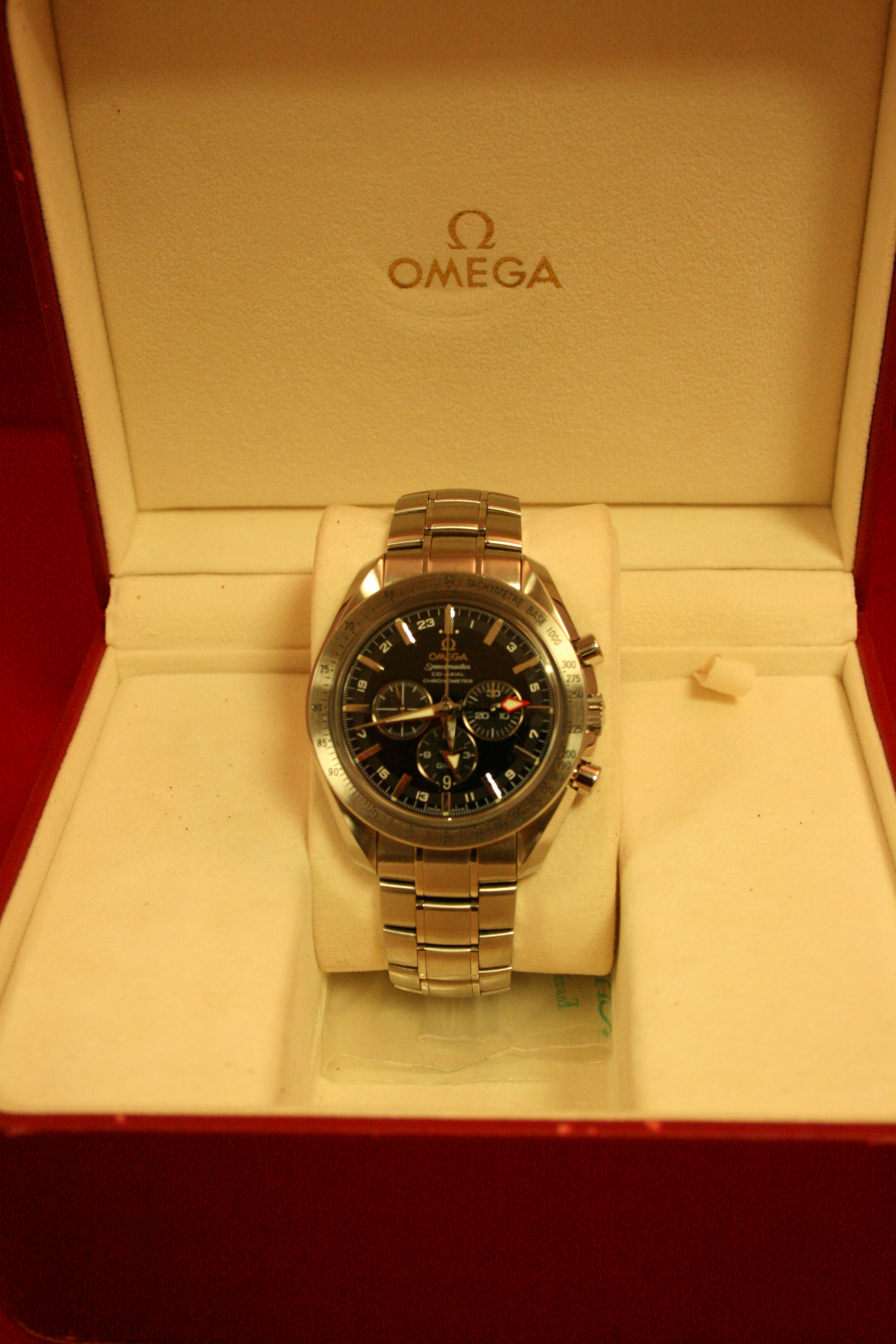 Omega 3581.50.00 Speedmaster Broad Arrow GMT, 35815000, Stainless Steel on a Stainless Steel Bracelet, Automatic, Black Dial with Silver Hour Markers and Luminous Hands, Co-Axial, Date at 6 O'clock, Chronograph, Red Arrow Indicates Second Time Zone, COSC, Small Seconds at 9 O'clock, Diameter: 44 mm, Thickness: 15.4 mm, Sapphire Crystal, Display Back, Water Resistant. Box and Papers.