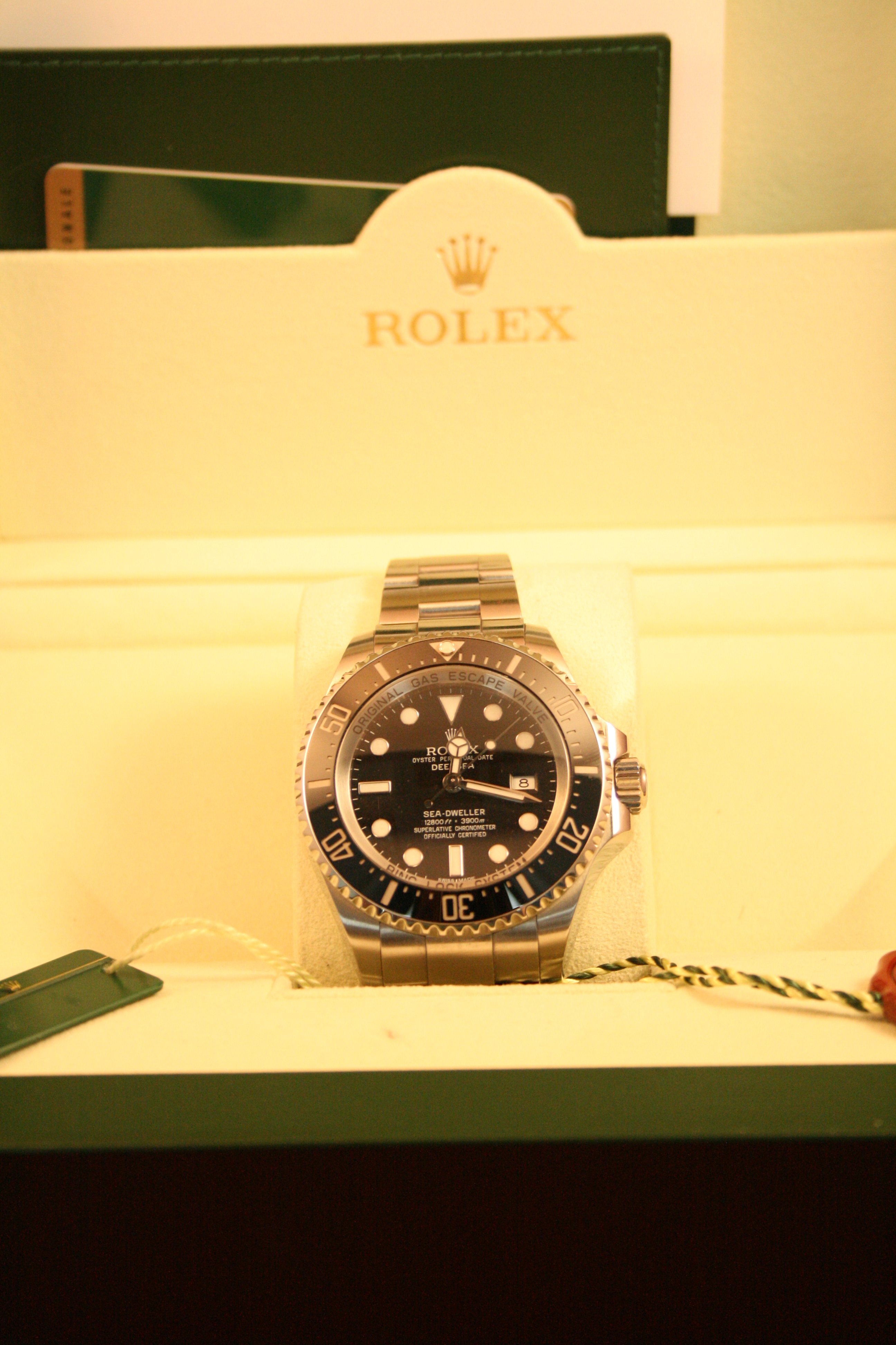 Rolex Oyster Perpetual Sea Dweller DEEPSEA 116660. Case diameter 43mm. Water resistant to 3,900 meters (12,800ft) Automatic Chronometer movement. Black dial with luminous blue hour markers and hands. 60-minute graduated Cerachrom disc Uni-directional rotatable bezel, the numerals and graduations are filled with platinum by a patented Rolex technique. RINGLOCK system which allows the case to withstand 2.98 metric tonnes of water pressure. Steel Oyster bracelet with Double Expansion System, manufactured from solid 904L steel, the bracelet can be adjusted to wear over a dive suit up to 7mm thick, double expansion system with flip lock. Box and papers dated May 2012.