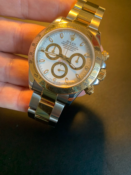 Rolex Daytona Model 116523. White Dial with Gold Indexes. Bi Metal Case & Bracelet with Comfort Extension. No Box or Papers. F912XXX Serial (2003 – 2005)